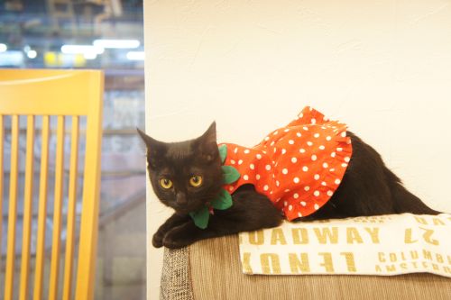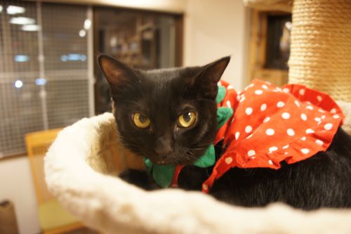スタッフが保護した元野良。お店に迎えた数日後に脱走。10日後に無事発見・保護されるという異例のデビューを果たした。 ニンゲンには非常になつっこい。性格は男の子っぽく、おにぎり兄弟を付け狙っている。うずらとは遊び仲間。